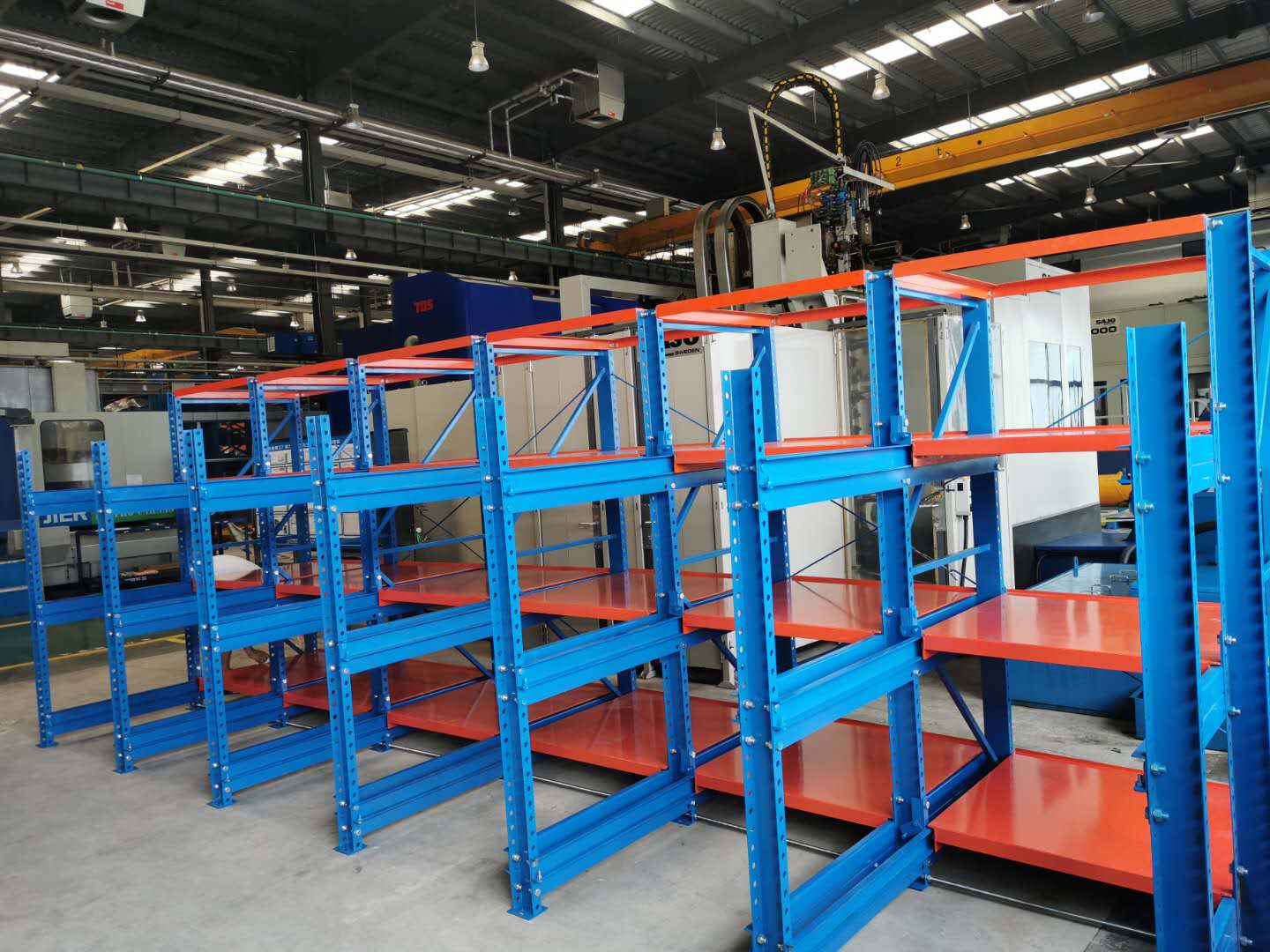 上圖是我司給沈陽一家公司生產定制模具貨架,模具架規格:L5700*D2600*H2090 數量一排、層數為3層加固定板 每層載重1000KG,可抽屜1300MM,立柱10#槽鋼,滑槽4.0+3.0厚度,面板1.5mm 抽屜板可按50倍數調節層高 顏色:立柱藍色/抽板桔紅色 噴涂 酸洗 磷化 防靜電噴涂