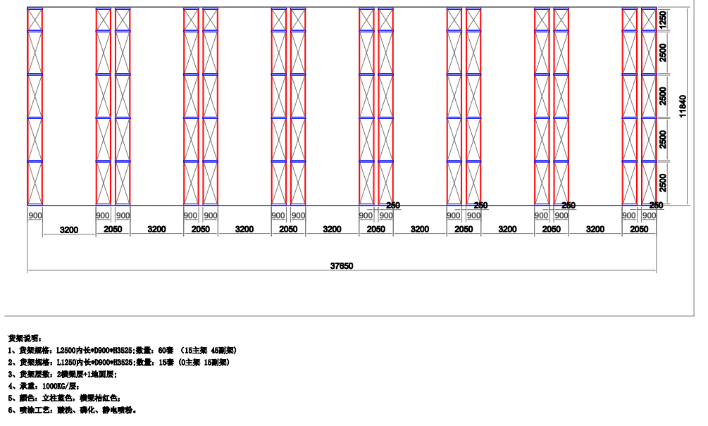 1、貨架規格:L2500*D900*H3525 數量:60套 (15主45副)
