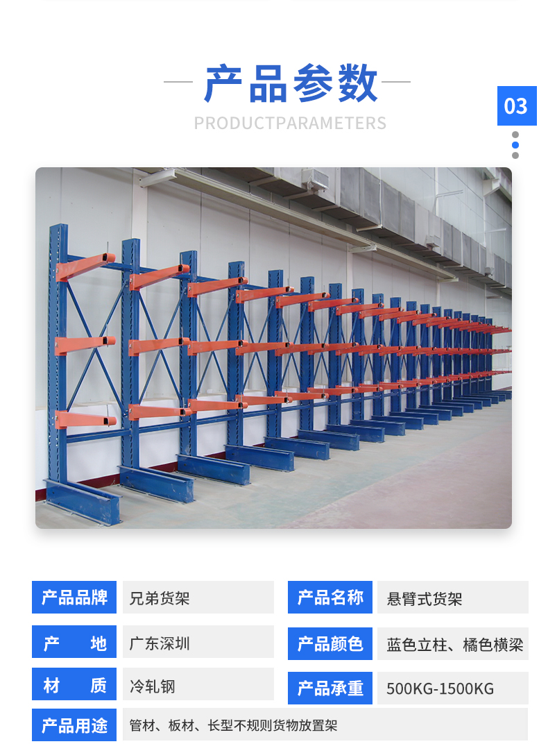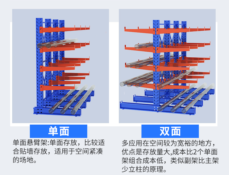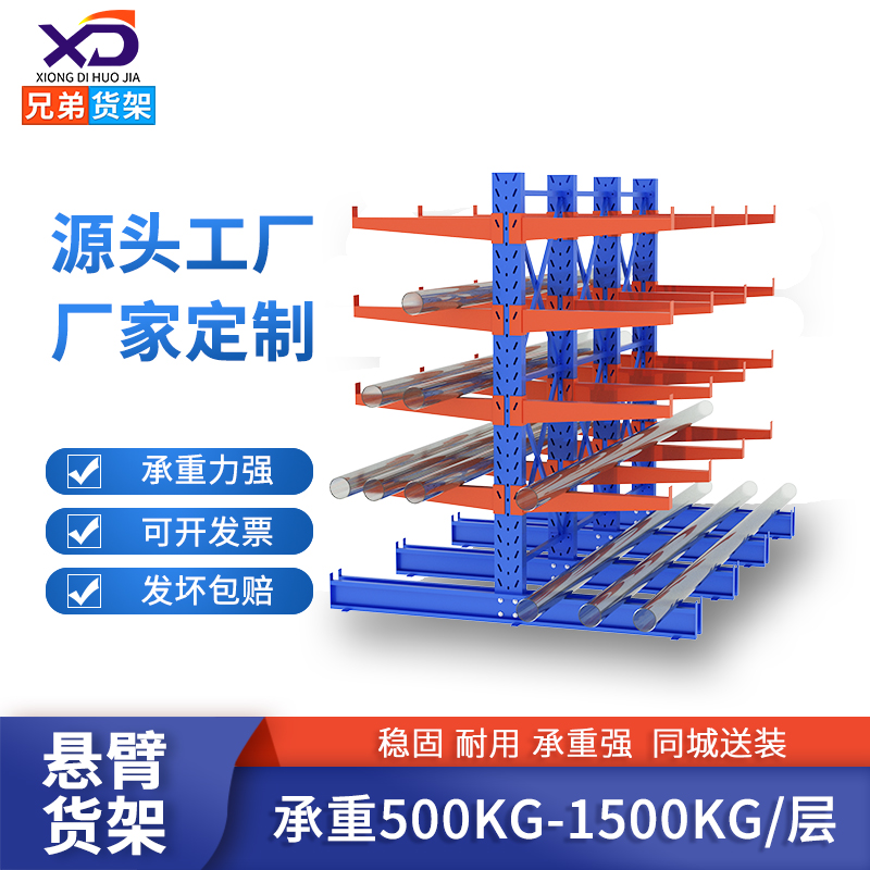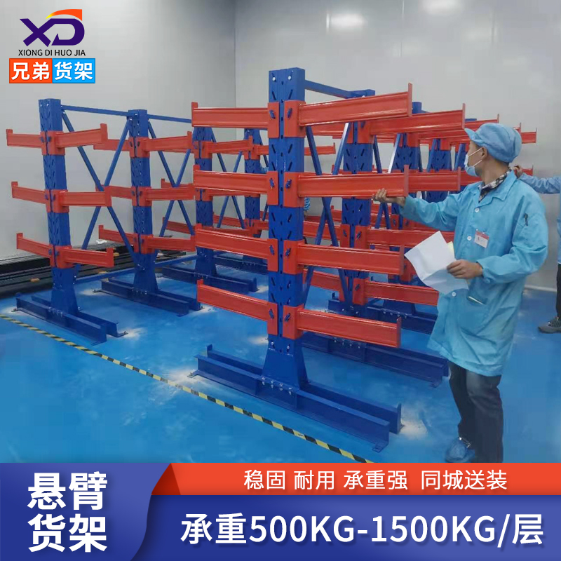 懸臂式貨架有單臂和雙臂之分,專用立柱型材,設計背拉增強穩固型,高強度懸臂,每臂承重可達2T以上,高度依每100mm為單元上下調節